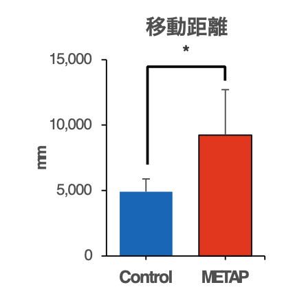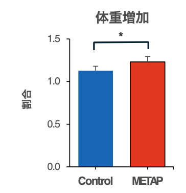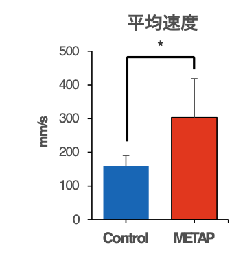 結果、図に示す通り、メタップ®群ではコントロール群と比較して、体重が有意に増加していました。また、運動機能は、泳ぐ速度、距離いずれも有意に増加していました。