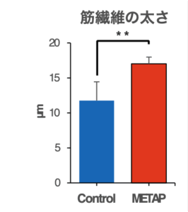 結果、図に示す通り、メタップ®群では、筋繊維の太さがコントロール群に比べて約1.5倍に増加していました。
